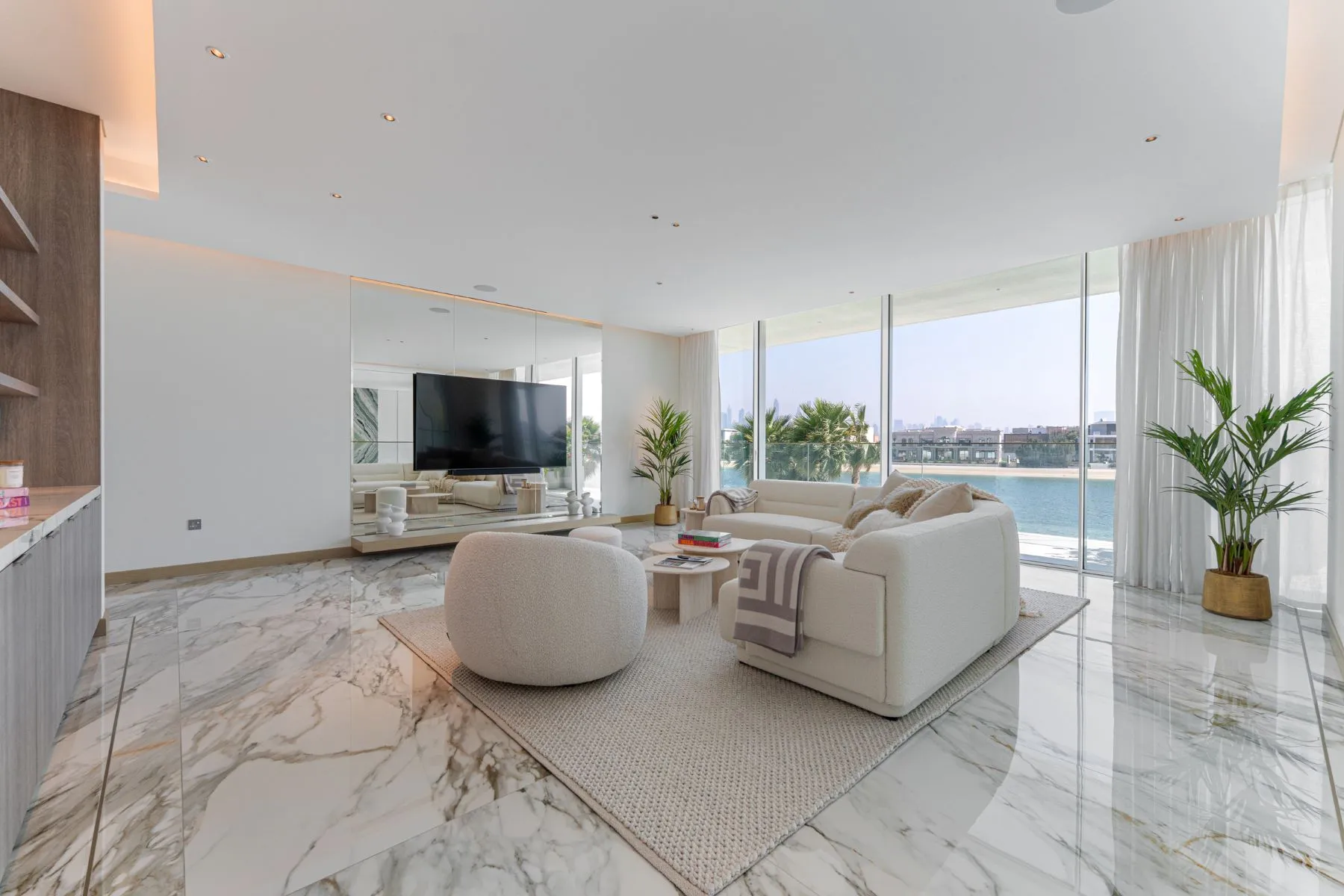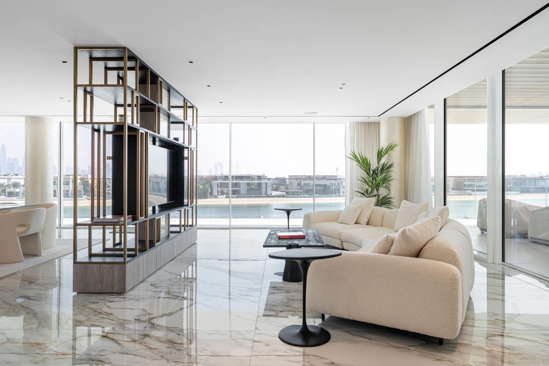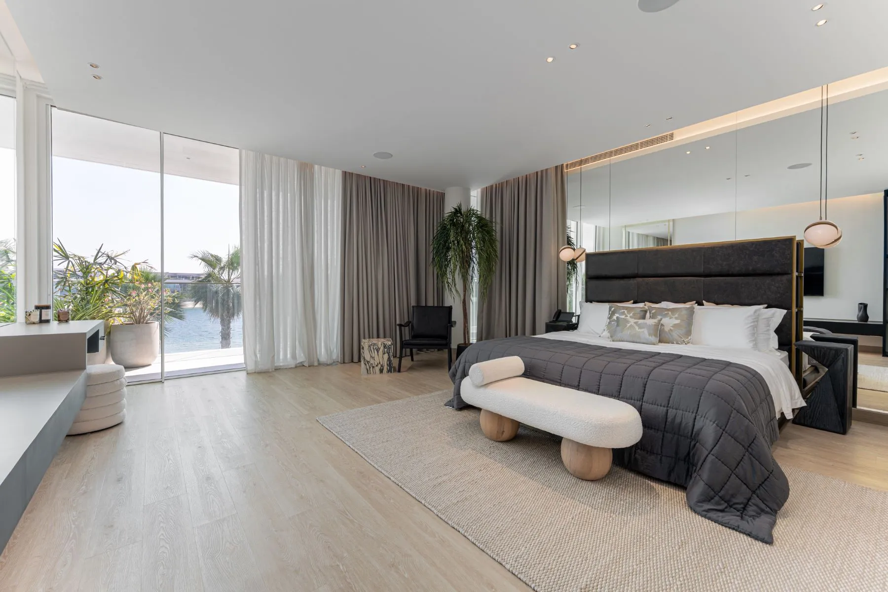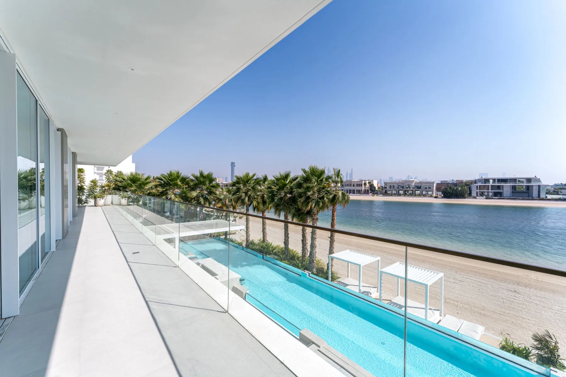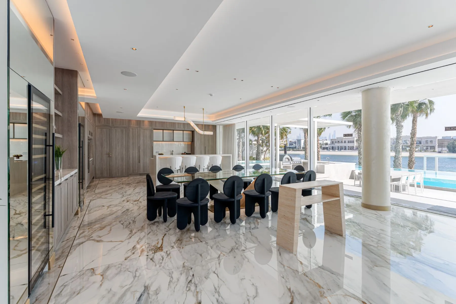 Diese maßgeschneiderte, moderne Strandvilla mit sechs Schlafzimmern und einem Büro auf Frond I in Palm Jumeirah ist ein beeindruckendes Beispiel zeitgenössischer Architektur. Die zweistöckige Villa erstreckt sich über 1.500 m² Wohnfläche und verfügt über einen Keller – eine Seltenheit auf der Insel – und bietet einen Lebensstil voller Luxus und Komfort. Beim Näherkommen deutet die moderne Fassade auf ihre beeindruckende Größe und Pracht hin. Im Inneren besticht der offene Wohnbereich durch raumhohe Fenster und eine stilvolle Inneneinrichtung, die mit maßgefertigten Möbeln einem Kunstwerk gleicht.
