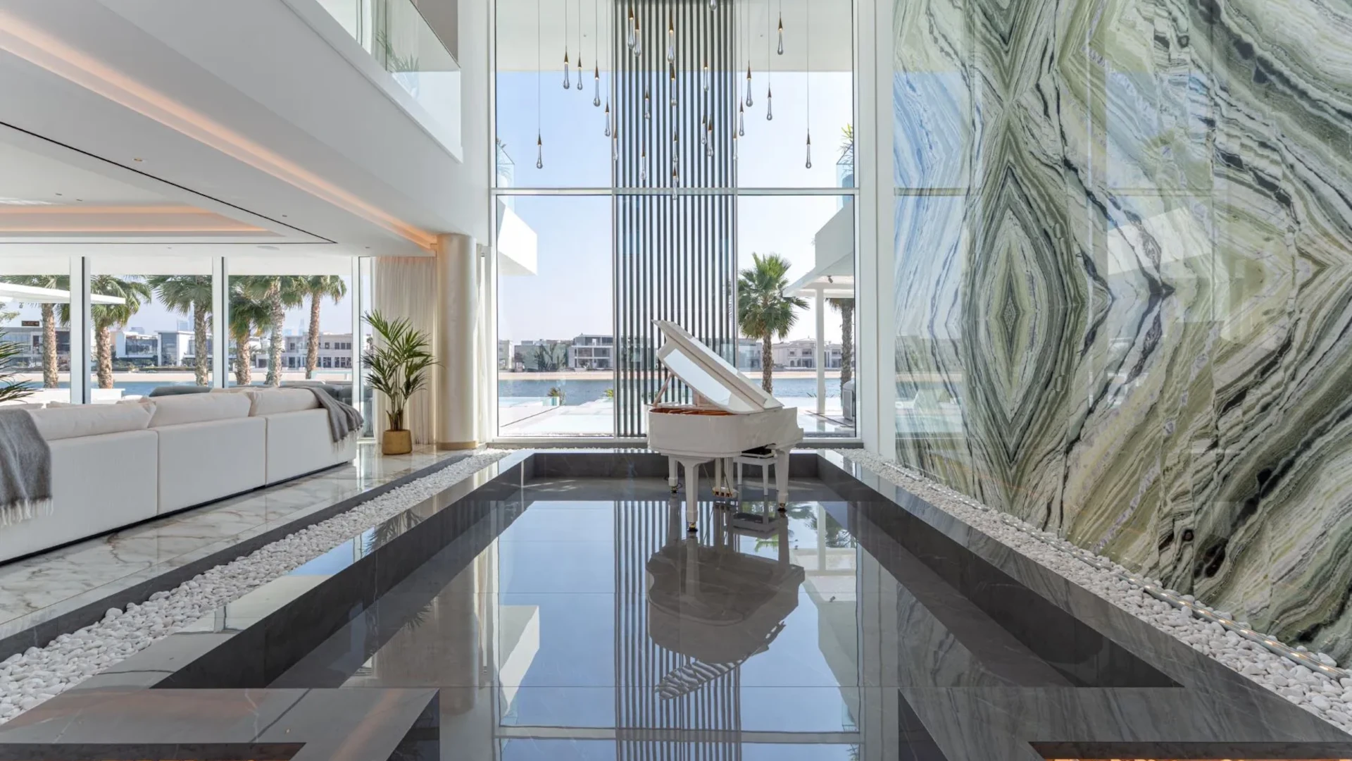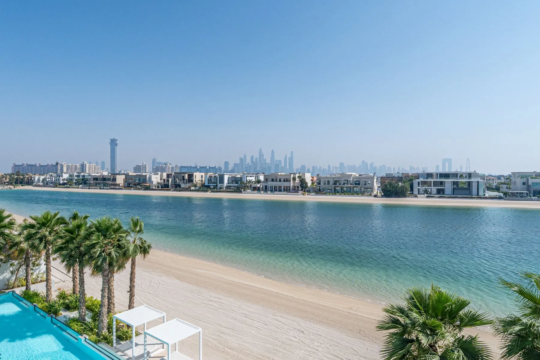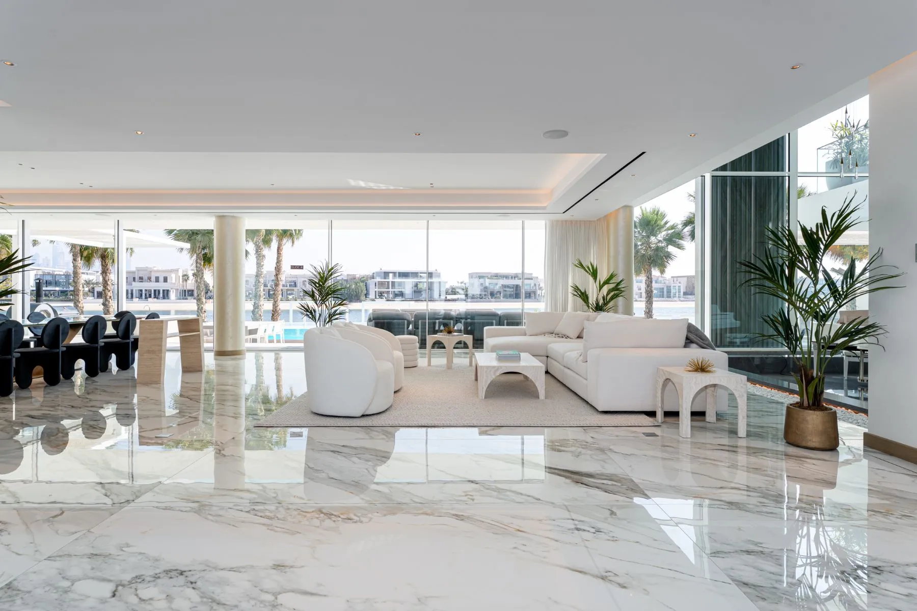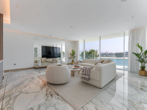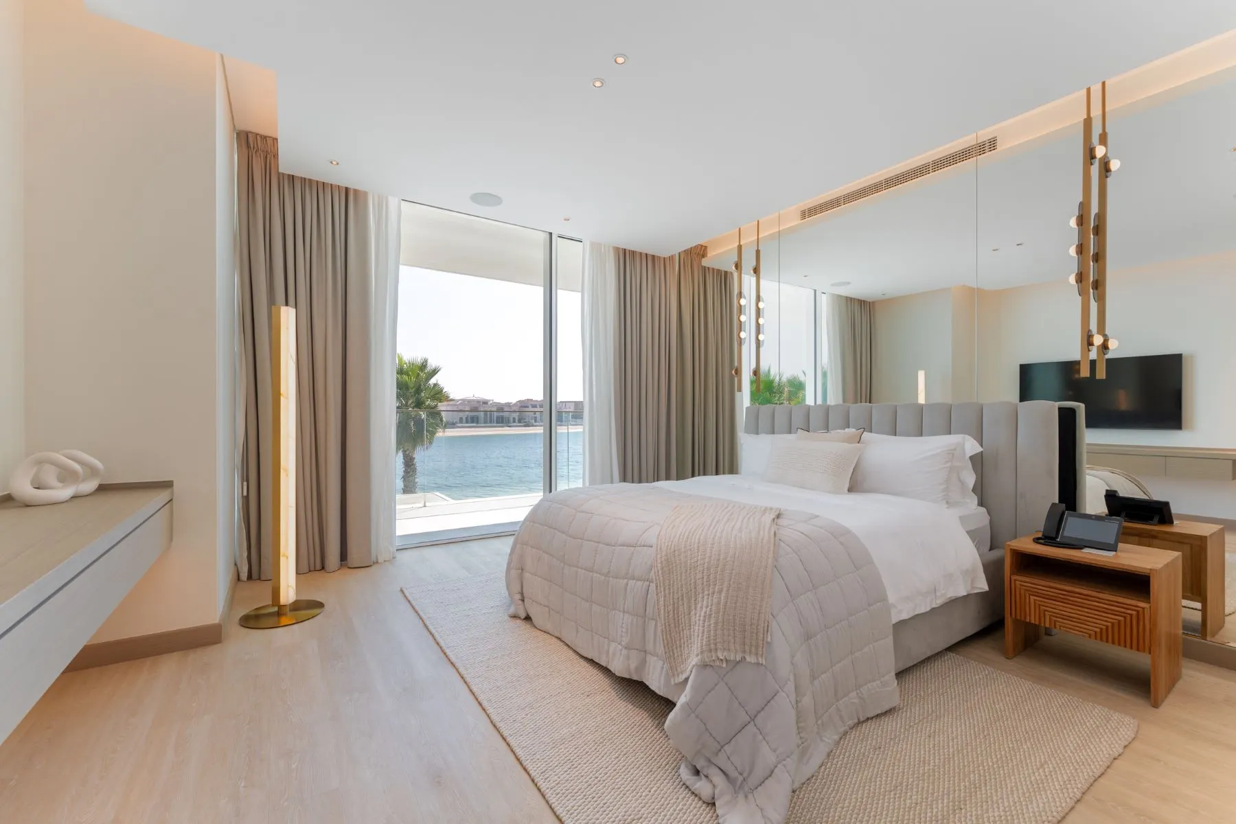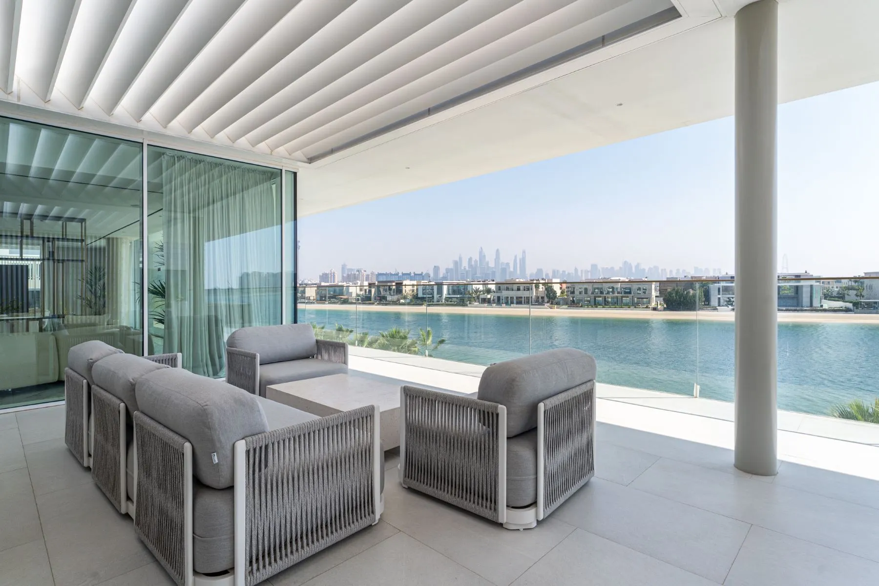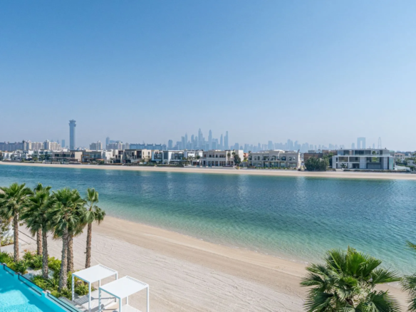 Diese maßgeschneiderte, moderne Strandvilla mit sechs Schlafzimmern und einem Büro auf Frond I in Palm Jumeirah ist ein beeindruckendes Beispiel zeitgenössischer Architektur. Die zweistöckige Villa erstreckt sich über 1.500 m² Wohnfläche und verfügt über einen Keller – eine Seltenheit auf der Insel – und bietet einen Lebensstil voller Luxus und Komfort. Beim Näherkommen deutet die moderne Fassade auf ihre beeindruckende Größe und Pracht hin. Im Inneren besticht der offene Wohnbereich durch raumhohe Fenster und eine stilvolle Inneneinrichtung, die mit maßgefertigten Möbeln einem Kunstwerk gleicht.