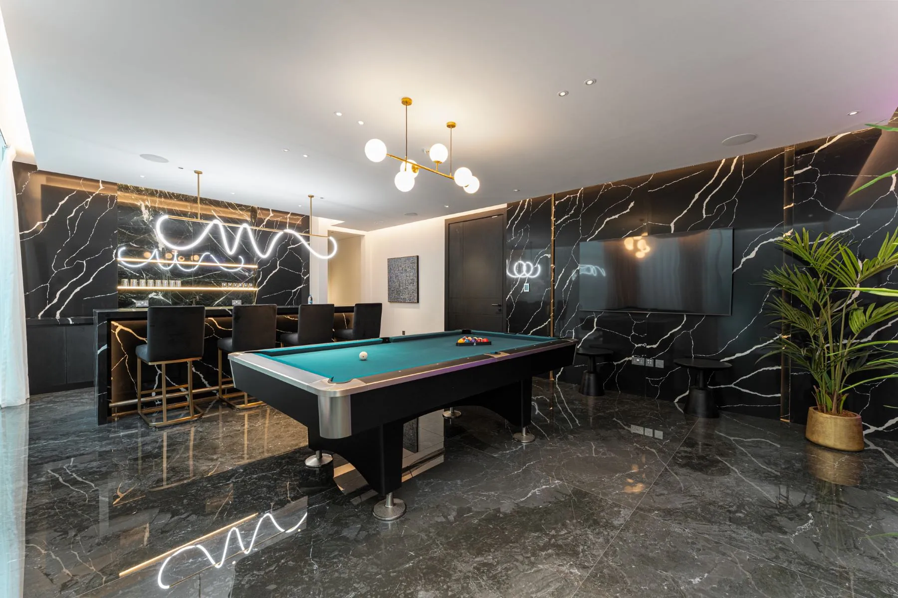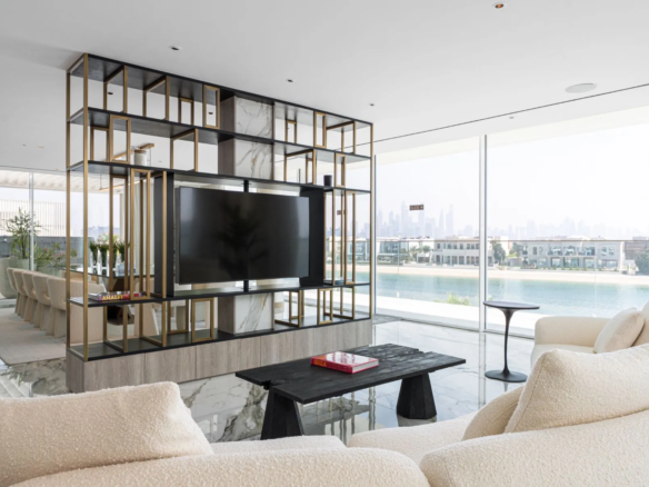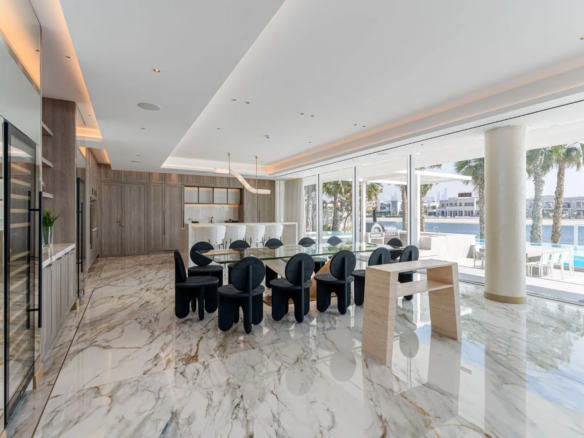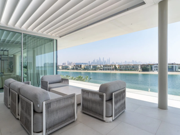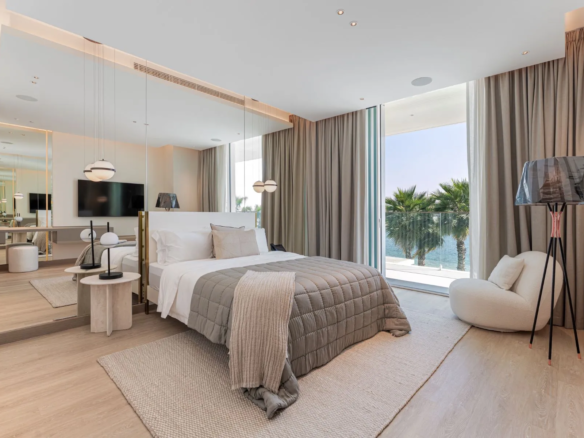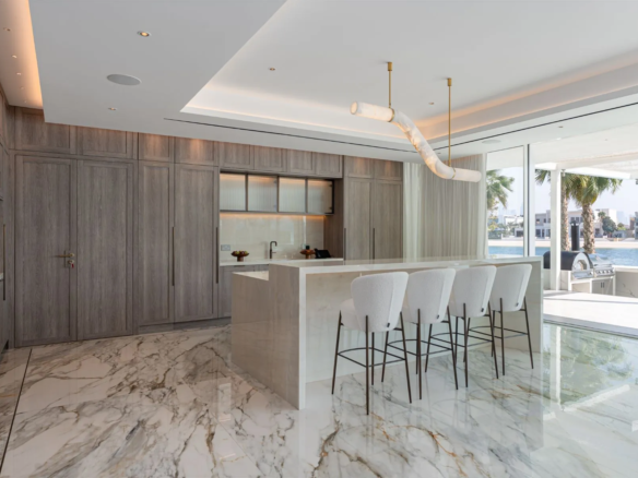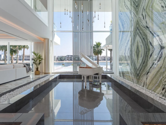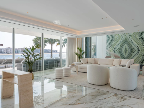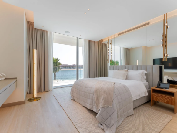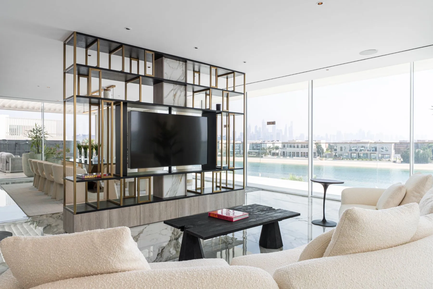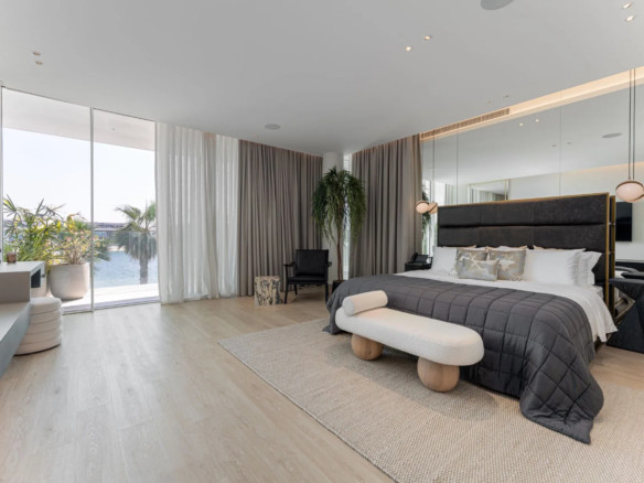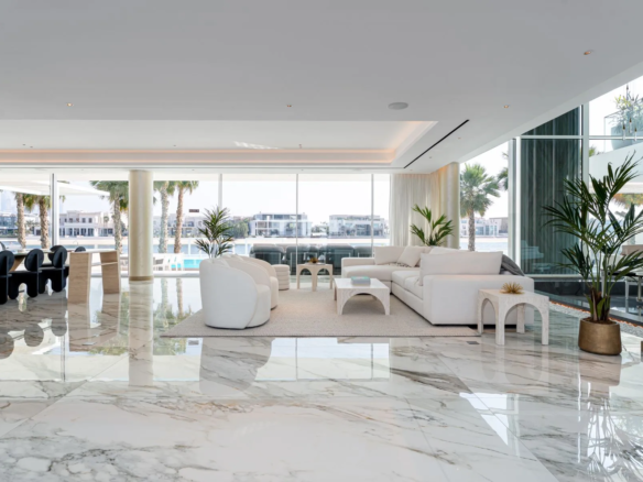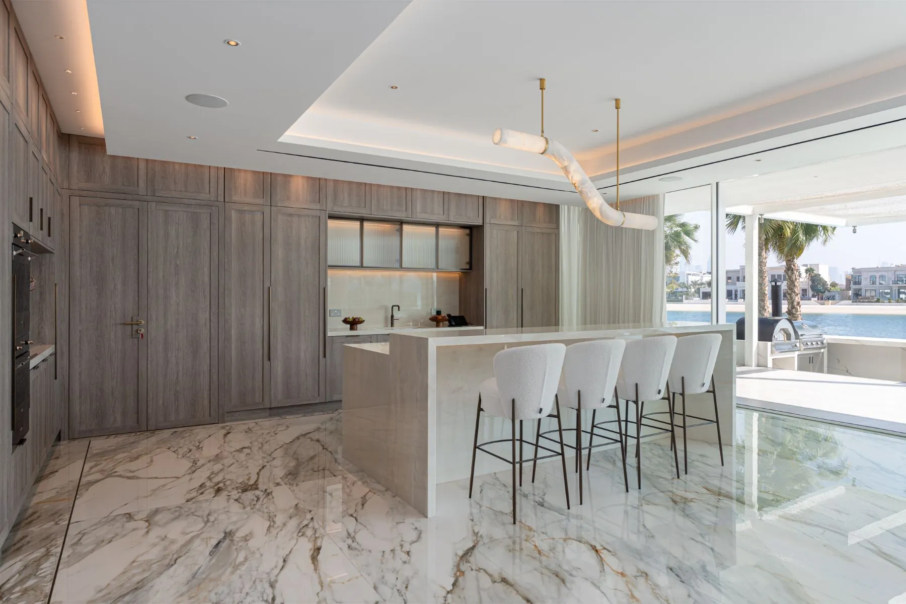 Diese maßgeschneiderte, moderne Strandvilla mit sechs Schlafzimmern und einem Büro auf Frond I in Palm Jumeirah ist ein beeindruckendes Beispiel zeitgenössischer Architektur. Die zweistöckige Villa erstreckt sich über 1.500 m² Wohnfläche und verfügt über einen Keller – eine Seltenheit auf der Insel – und bietet einen Lebensstil voller Luxus und Komfort. Beim Näherkommen deutet die moderne Fassade auf ihre beeindruckende Größe und Pracht hin. Im Inneren besticht der offene Wohnbereich durch raumhohe Fenster und eine stilvolle Inneneinrichtung, die mit maßgefertigten Möbeln einem Kunstwerk gleicht.