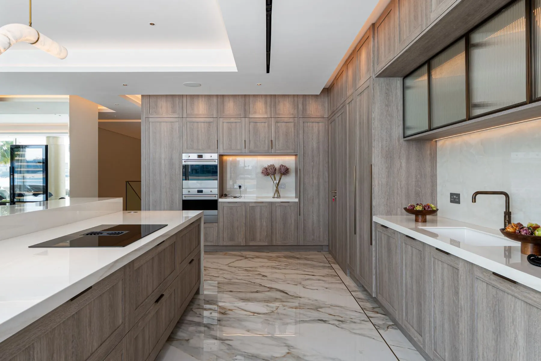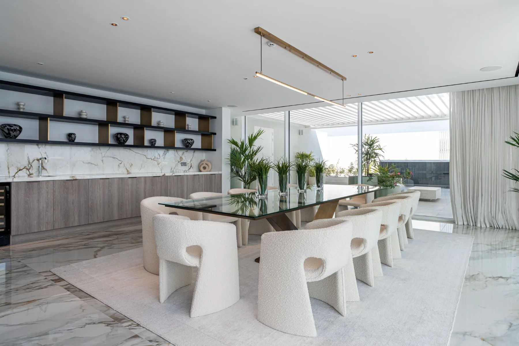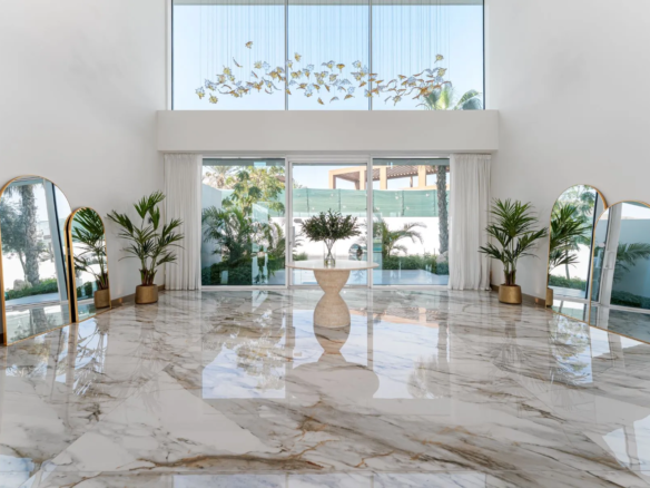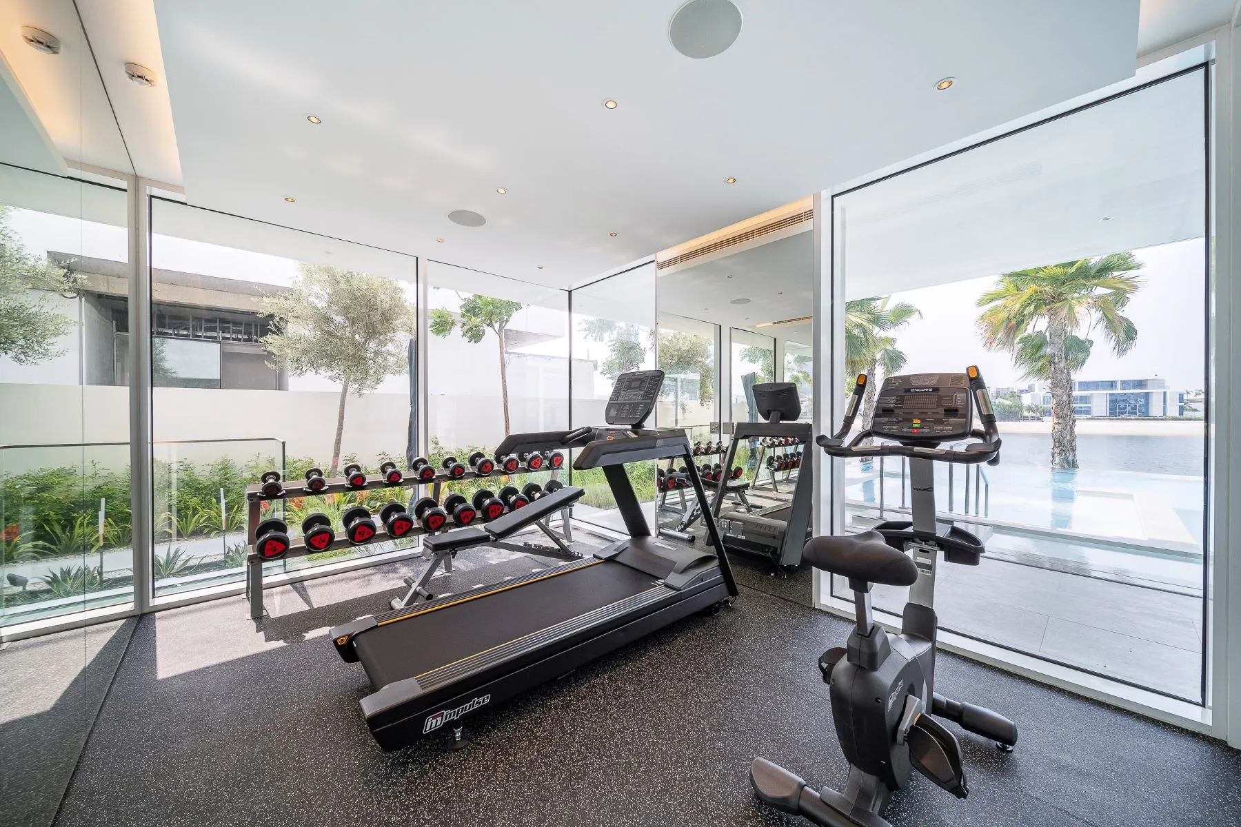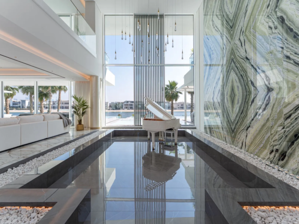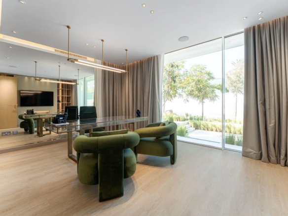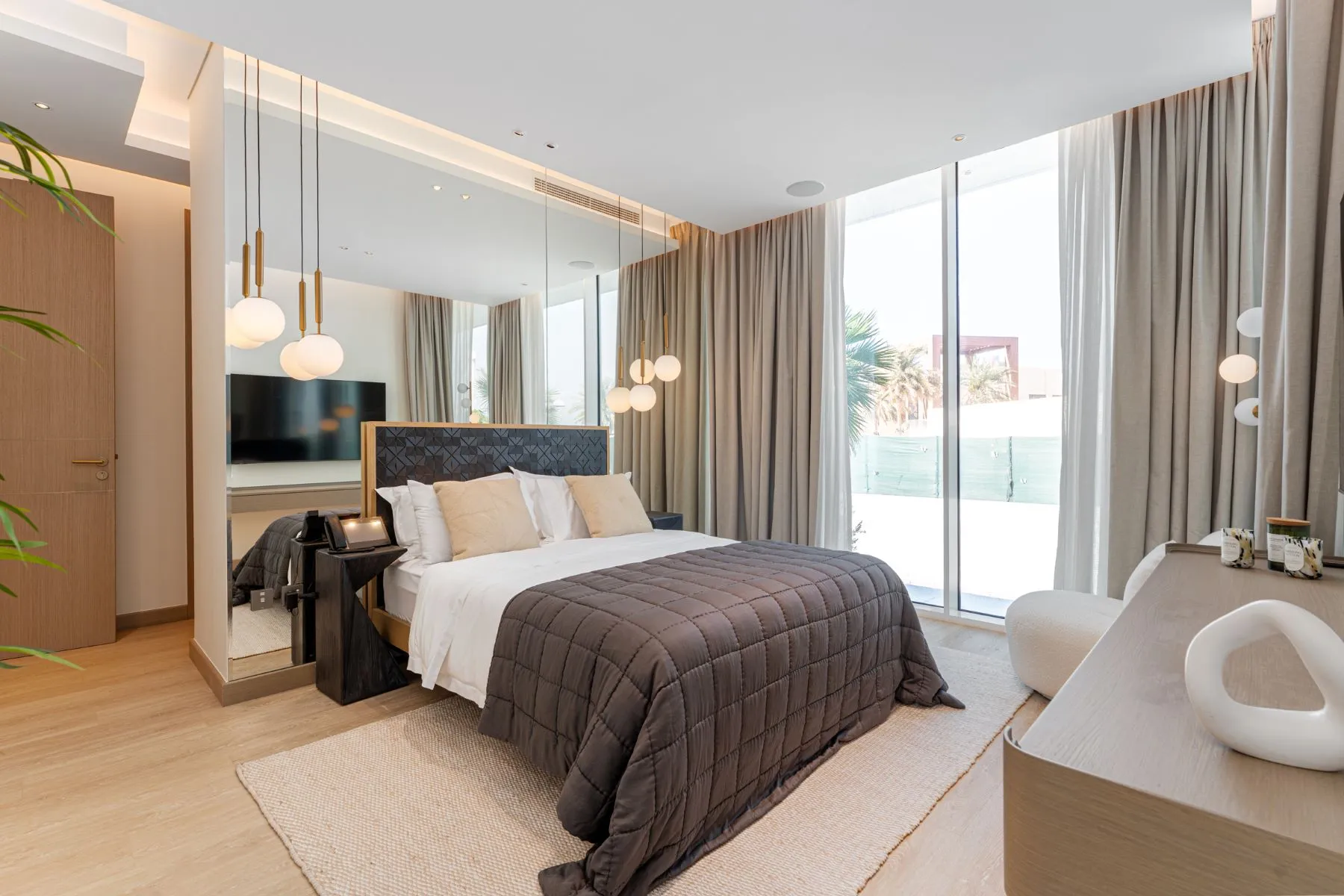 Diese maßgeschneiderte, moderne Strandvilla mit sechs Schlafzimmern und einem Büro auf Frond I in Palm Jumeirah ist ein beeindruckendes Beispiel zeitgenössischer Architektur. Die zweistöckige Villa erstreckt sich über 1.500 m² Wohnfläche und verfügt über einen Keller – eine Seltenheit auf der Insel – und bietet einen Lebensstil voller Luxus und Komfort. Beim Näherkommen deutet die moderne Fassade auf ihre beeindruckende Größe und Pracht hin. Im Inneren besticht der offene Wohnbereich durch raumhohe Fenster und eine stilvolle Inneneinrichtung, die mit maßgefertigten Möbeln einem Kunstwerk gleicht.