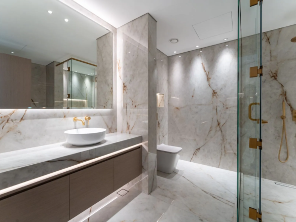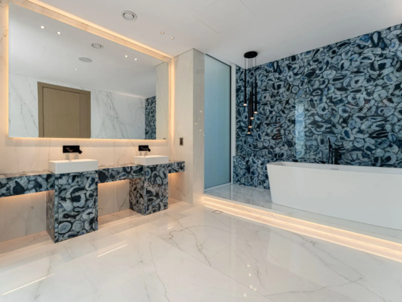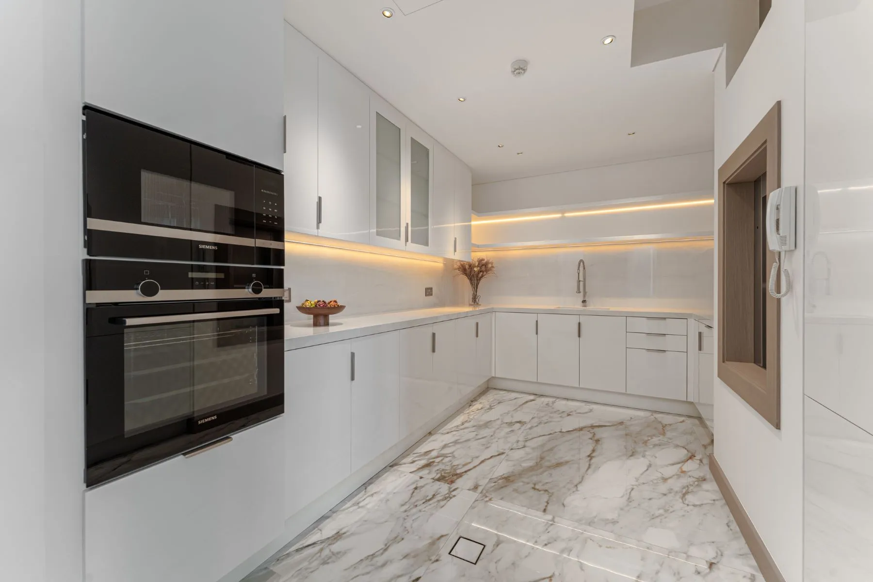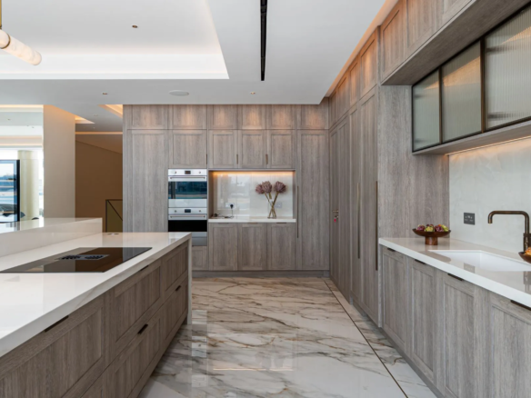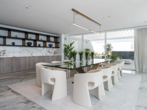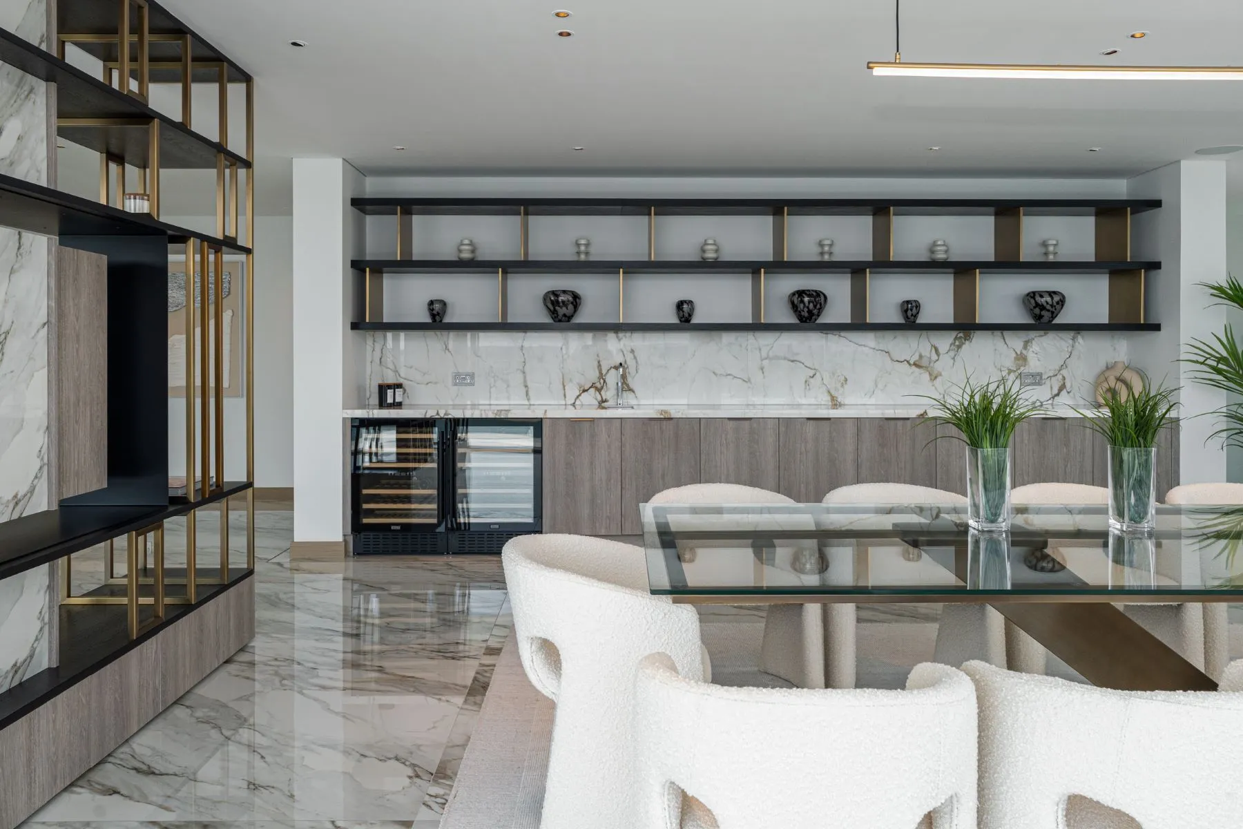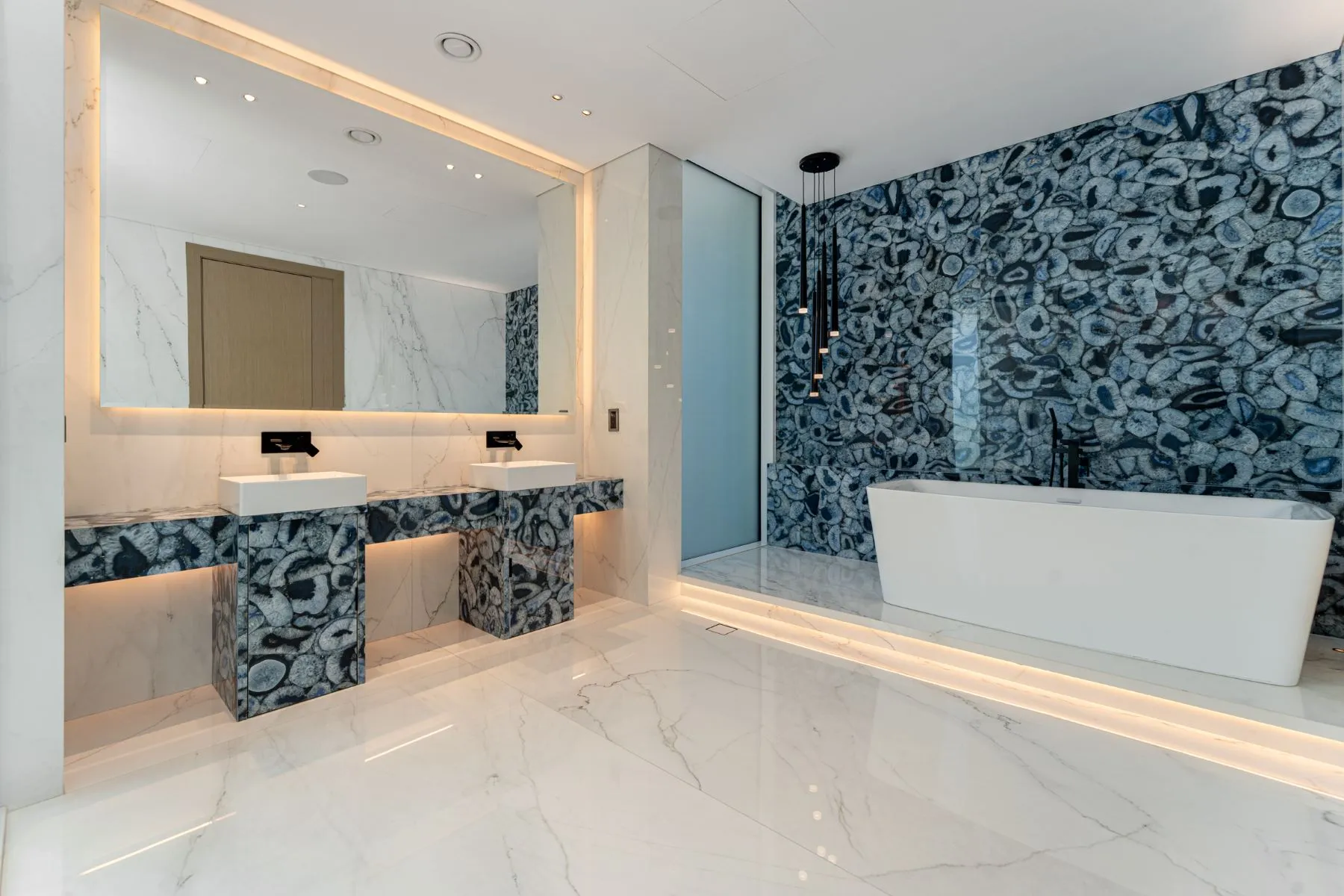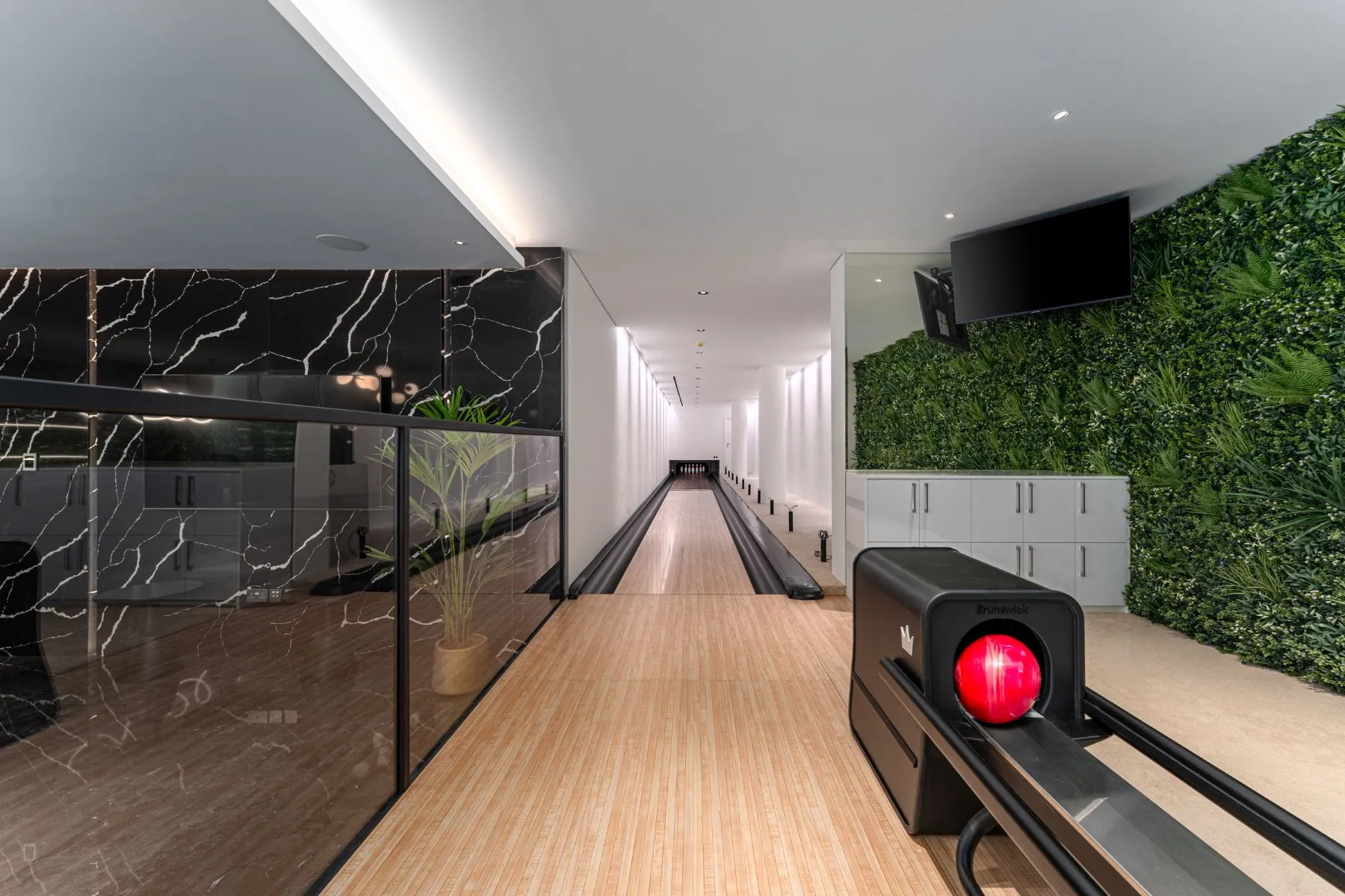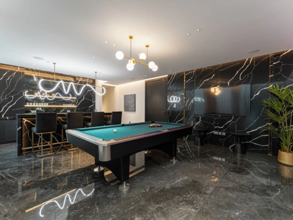 Diese maßgeschneiderte, moderne Strandvilla mit sechs Schlafzimmern und einem Büro auf Frond I in Palm Jumeirah ist ein beeindruckendes Beispiel zeitgenössischer Architektur. Die zweistöckige Villa erstreckt sich über 1.500 m² Wohnfläche und verfügt über einen Keller – eine Seltenheit auf der Insel – und bietet einen Lebensstil voller Luxus und Komfort. Beim Näherkommen deutet die moderne Fassade auf ihre beeindruckende Größe und Pracht hin. Im Inneren besticht der offene Wohnbereich durch raumhohe Fenster und eine stilvolle Inneneinrichtung, die mit maßgefertigten Möbeln einem Kunstwerk gleicht.